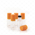 Contents: 5 x 5ml clear bottles with tangerine (orange) caps and new style stainless steel rollerballs