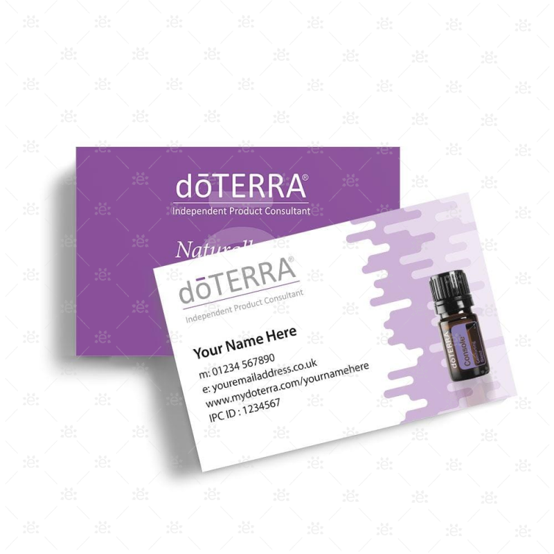 Our dōTERRA® approved business cards are produced using 350 gsm coated card stock with a matte front, silk-coated back and a durable feel. Matte varnish has a rich texture for a classic and elegant look. They are available in a 2 sided option, or a 4 sided option which includes a tear off card to collect your customer's details. The 4 sided folding cards are perforated in the middle for easy separation.