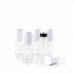 Contents: 5 x 5ml clear bottles with snow (white) cap and new style stainless steel rollerballs