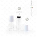 5ml Clear Glass Roller Bottle with Snow (White) Lid & Premium Stainless Steel Rollerball - 5 pack (NEW STYLE)