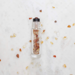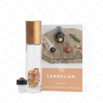 Contents: 1 x Carnelian gemstone rollerball, 10ml clear roller bottle approximately 1/3 full of Carnelian gemstone chips, co-ordinated aluminium cap & instructional card.