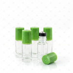 Contents: 5 x 5ml clear bottles with fern (green) caps and new style stainless steel rollerballs
