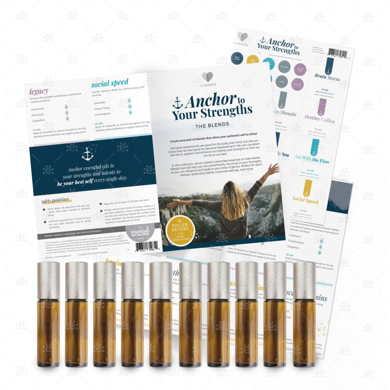 MyMakes Anchor to Your Strengths includes 10 essential oil recipe blends that highlight natural strengths and how we can boost these with the correct pairing of essential oils. The benefits of these blends will help you shine in your career, social life, as a leader, or a business owner.