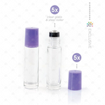 Contents: 5 x 10ml clear bottles with amethyst (purple) cap and new style stainless steel rollerballs