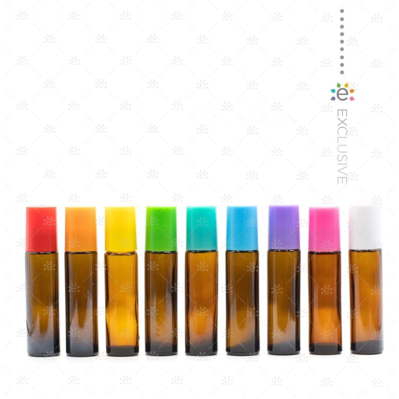 Contents: 9 x Amber Glass Roller Bottles with Premium Stainless Rollers and Signature Multi-coloured Plastic Caps and Clear Zipper Pouch