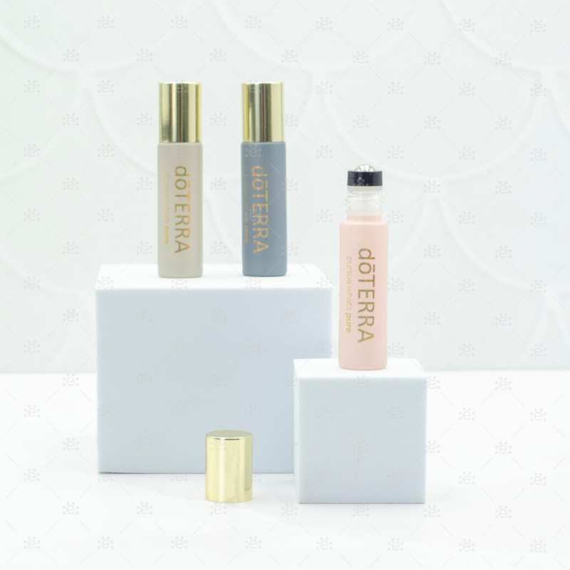 Contents: Set of 3 x 10ml dōTERRA Branded Matte Glass Roller Bottles, Premium Stainless Steel Rollers and Gold Caps.